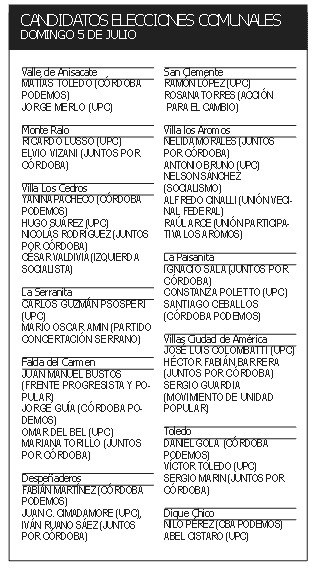 Esto constituye un desafió nuevo a jefes comunales que en algunos casos llevan décadas en el poder, ahora, con oposición. En la imagen, el listado completo de las localidades y los candidatos de cada fuerza.