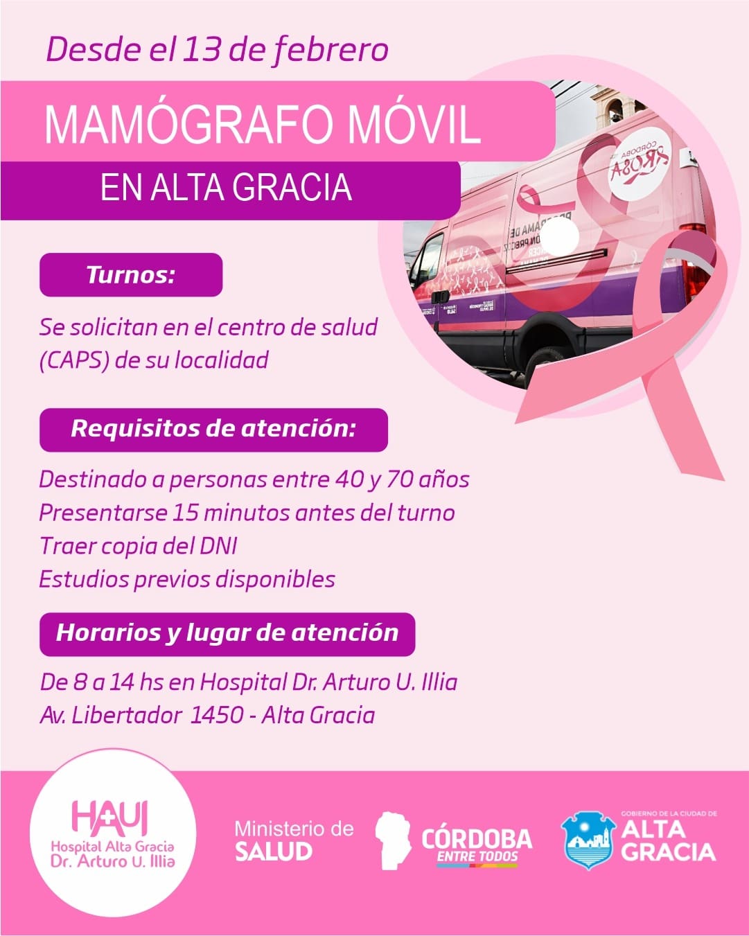 En una gestión conjunta de la Secretaría de Salud, Desarrollo y Equidad Municipal y el Hospital Arturo Illia se dictó la disponibilidad de un mamógrafo móvil en Alta Gracia a partir del lunes 13. El estudio se realizará en el hospital de la ciudad de lunes a viernes en el horario de 08:00 a 14:00 hs. El mismo será con turno previo el cual debe ser solicitado por el paciente en el Centro de Salud Municipal de su barrio.