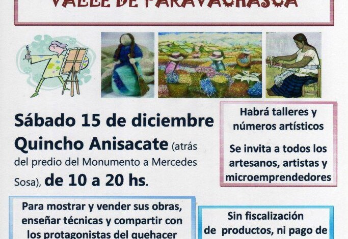 El Sábado 15 de diciembre se realizará en el Quincho Anisacate (atrás del Monumento a Mercedes Sosa), de 10 a 20 hs. un importante encuentro de Artesanos, Artistas y Micro Emprendedores. El motivo del mismo es mostrar y vender sus obras, enseñar técnicas y compartir con los protagonistas del quehacer cultural de Paravachasca.