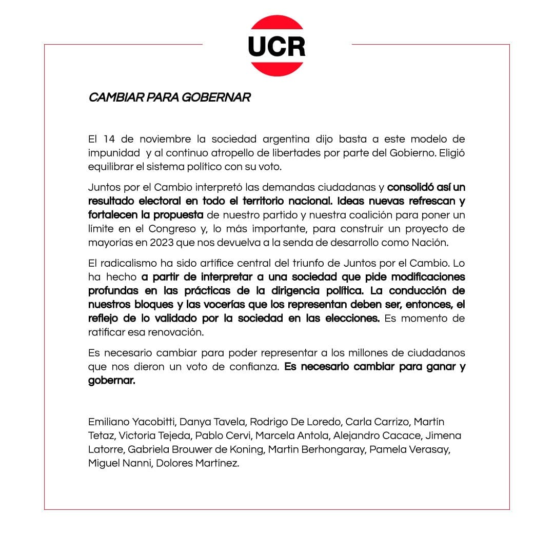 La respuesta no se hizo esperar y una quincena de Diputados Radicales electos, entre los que se encuentran Rodrigo de Loredo y Gabriela Brouwer de Koning, le respondió a Negri a través de un comunicado en el que aseguraron que “el Radicalismo ha sido artífice central del triunfo de Juntos por el Cambio. Lo ha hecho a partir de interpretar a una sociedad que pide modificaciones profundas en las prácticas de la dirigencia política. La conducción de nuestros bloques y las vocerías que los representan deben ser, entonces, el reflejo de lo validado por la sociedad en las elecciones. Es momento de ratificar esa renovación. Es necesario cambiar para ganar y gobernar”, cerró el escrito.
