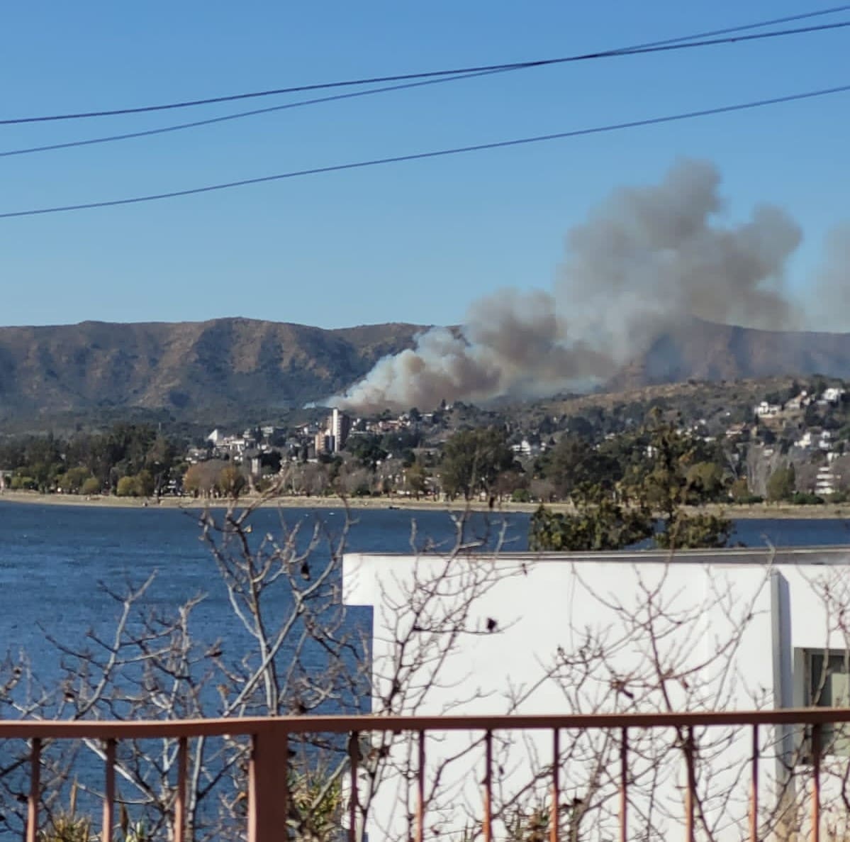 El frente de fuego, avivado por los fuertes vientos, tiene lugar en inmediaciones del paredón del Dique San Roque con dirección a la Ruta 20.