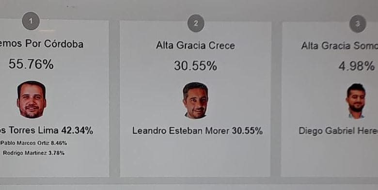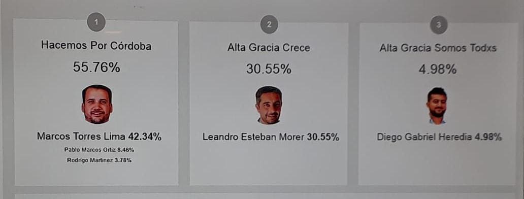 Las bocas de urna esta tarde a las 18 horas, cuando finalizaron los comicios, largaban un resultado contundente: la victoria de Marcos Torres sobre Leo Morer con 20 puntos de diferencia. No obstante, pasadas ya tres horas de conteo de votos, los resultados se achicaron: el precandidato de Hacemos por Córdoba le lleva ahora doce puntos de diferencia al de Alta Gracia Crece. Diego Heredia, de Alta Gracia Somos Todxs consiguió casi 5%