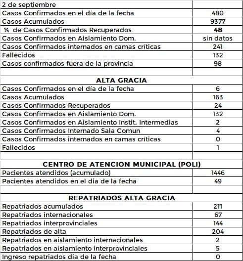 Este miércoles finalizó con nuevos contagios por Coronavirus. Los mismos pertenecen a Alta Gracia, Despeñaderos y Malagueño, las 3 localidades con más casos dentro del departamento Santa María hasta el momento.