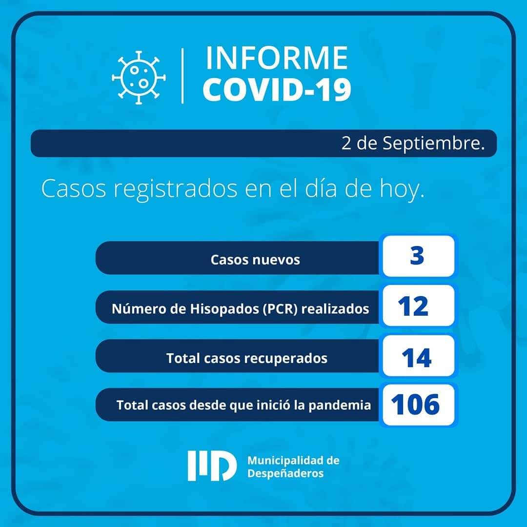 La localidad sumó 3 casos y llegó a los 106 desde el inicio de la pandemia, pero afortunadamente hay 14 recuperados. El total de hisopados que se hicieron hoy es de 12.