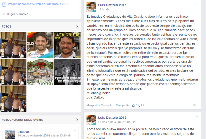 Las divisiones internas en el partido amarillo habían sido negadas por quien hasta el lunes a la noche era el referente en la ciudad, indicando que solo había dejado de mostrarse por cuestiones laborales, pero que él era el único precandidato de esa fuerza para las elecciones de 2015 “por pedidos reiterados de sus compañeros”. Sin embargo, el lunes por la noche Dáttolo comenzó a escribir cosas en contra del partido y anunciando su alejamiento del mismo: “Unos pocos que se han sumado hace unos meses con altos intereses personales y han logrado hacer de este espacio más de lo mismo”. Es más, indicó que había recibido amenazas: “En mi página personal he recibido amenazas de una de estas personas de tomar otras acciones si yo no elimino fotografías del partido, esa es la clase de gente que hoy está al frente de la fuerza”. Sobre su alejamiento, para la 88.9 FM Dáttolo comentó: “Desde el Pro me pidieron que no dijera nada que afecte el partido, pero a mí me gustan las cosas claras y de frente, quiero que aclaren qué tipo de acciones iban a tomar, a mí no me asusta nada”.