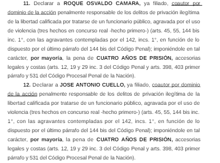 Roque Cámara y de José Antonio Cuello, estaban imputados por el delito de Privación Ilegítima de la Libertad Agravada reiterada en tres ocasiones en la Causa Montiveros, en la que se juzga el accionar de la Policía de la Provincia en los comienzos de la última dictadura cívico militar. Entre las 16 víctimas, esta el altagraciense Hugo Pavón, secuestrado en nuestra ciudad y desaparecido desde el 30 de abril de 1976. Hecho por el cual ambos policias retirados (también de Alta Gracia) en la mañana de ayer fueron sentenciados a cuatro años de prisión.