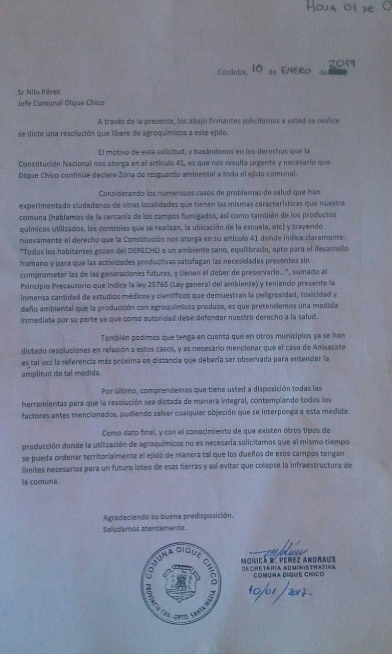 Más de cien vecinos presentaron una nota a la comuna de Dique Chico durante la jornada de este martes con la intención de que las autoridades liberen la zona de las fumigaciones.