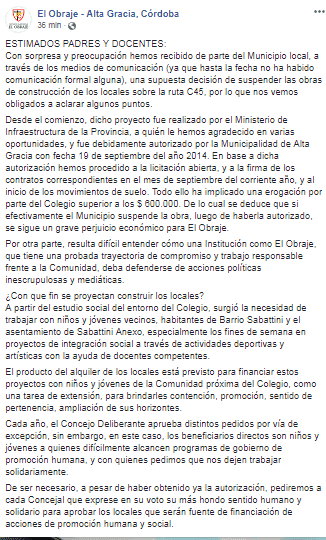 Esto, en respuesta a lo que ellos aseguran “se enteraron por los medios”: la decisión de la Municipalidad de suspender las obras de locales comerciales en la flamante institución ubicada sobre ruta C45. En el comunicado, dejan en claro además que consideran que el Colegio no debe defenderse de “acciones políticas inescrupulosas y mediáticas” y, que de ser real el parate, la institución perdería dinero ya que ya hicieron licitación, contratos, movimientos de suelo, etc.; lo que implicó un gasto inicial de 600 mil pesos por parte de la institución. Por lo que, si se suspende, perderían todo ese dinero.