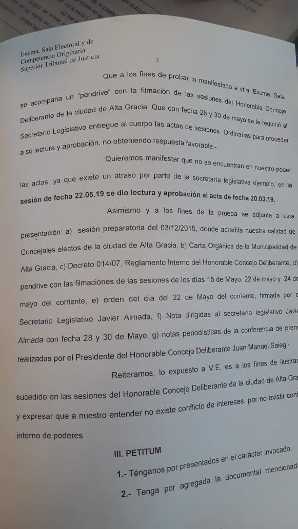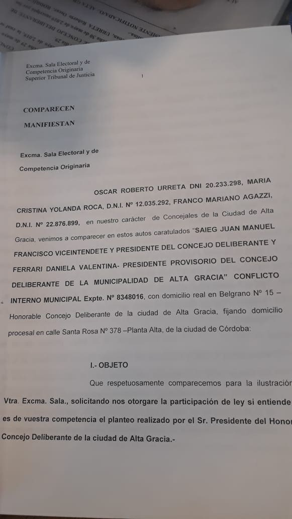 «Que hemos tomado conocimiento de la presentación efectuada por el Presidente del Honorable Concejo Deliberante de la ciudad de Alta Gracia, Juan Manuel Saieg, ante vtra. Excma. Sala, en virtud de la conferencia de prensa realizada por el mencionado junto a la Concejal Daniela Ferrari y del entonces secretario Legislativo Javier Almada en esta ciudad de Alta Gracia el día 28 de Mayo del corriente año.