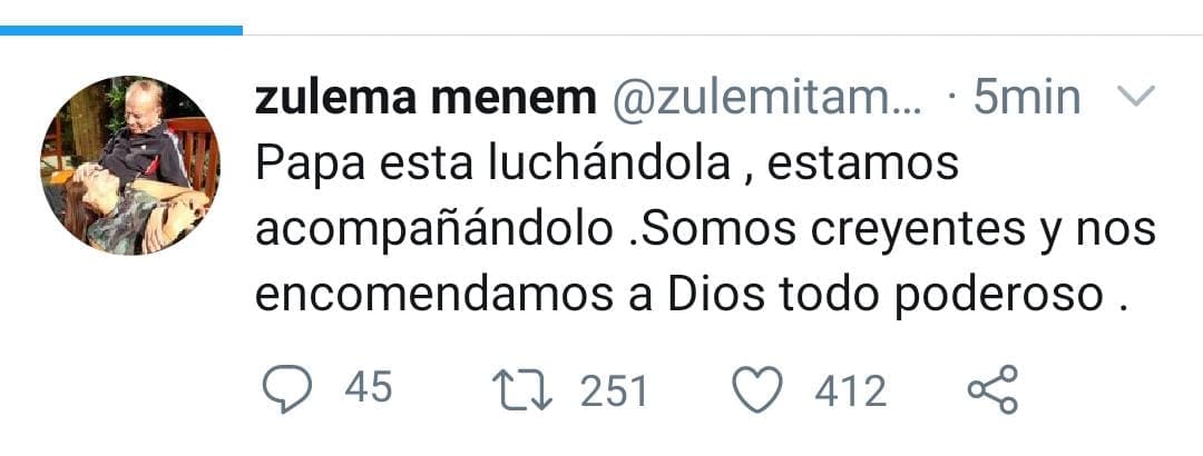 En su cuenta personal de Twitter, su hija Zulemita Menem expresó: «Papá está luchando, estamos acompañándolo. Somos muy creyentes y nos encomendamos a Dios todopoderoso».