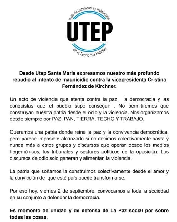 Por su parte, la Unión de Trabajadores y Trabajadoras de la Economía Popular (UTEP) expresaron: