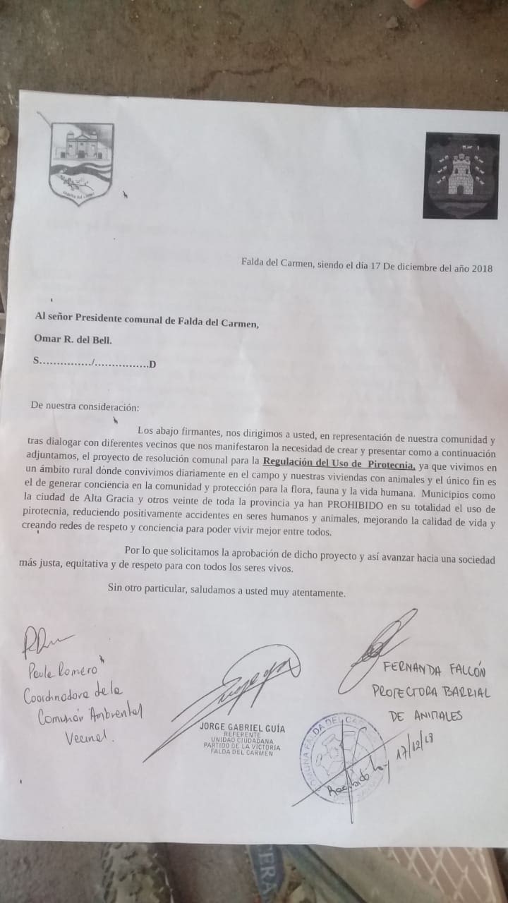 Se trata de un Proyecto de Ley que resuelve la regulación del uso, depósito y comercialización de Pirotecnia. La razón es que “es una zona rural donde convivimos diariamente en el campo y en las viviendas con animales, generando daños irreparables a la flora y fauna en época de festividades”, dice textual el comunicado de los impulsores. Además, aclaran que el proyecto también contempla la protección a los vecinos, a fines de que puedan evitarse accidentes en menores de edad por posibles quemaduras.