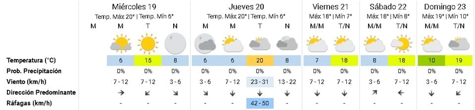JUEVES: Se prevé se establezca en la región un sistema de alta presión que migrará durante los próximos días hacia el este, con vientos cambiando al noreste 25Km. con ráfagas de 50 Km. y con temperaturas en poco más elevadas que el promedio para el mes de junio. Asimismo se espera un incremento de la humedad ambiente con escenarios de nubosidad variable.