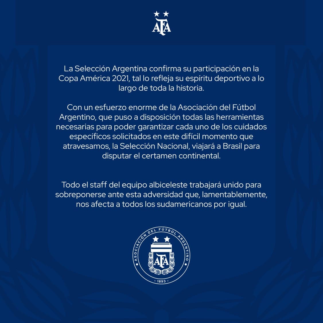 “La selección Argentina confirma su participación e la Copa América 2021, tal lo refleja su espíritu deportivo a lo largo de toda su historia.