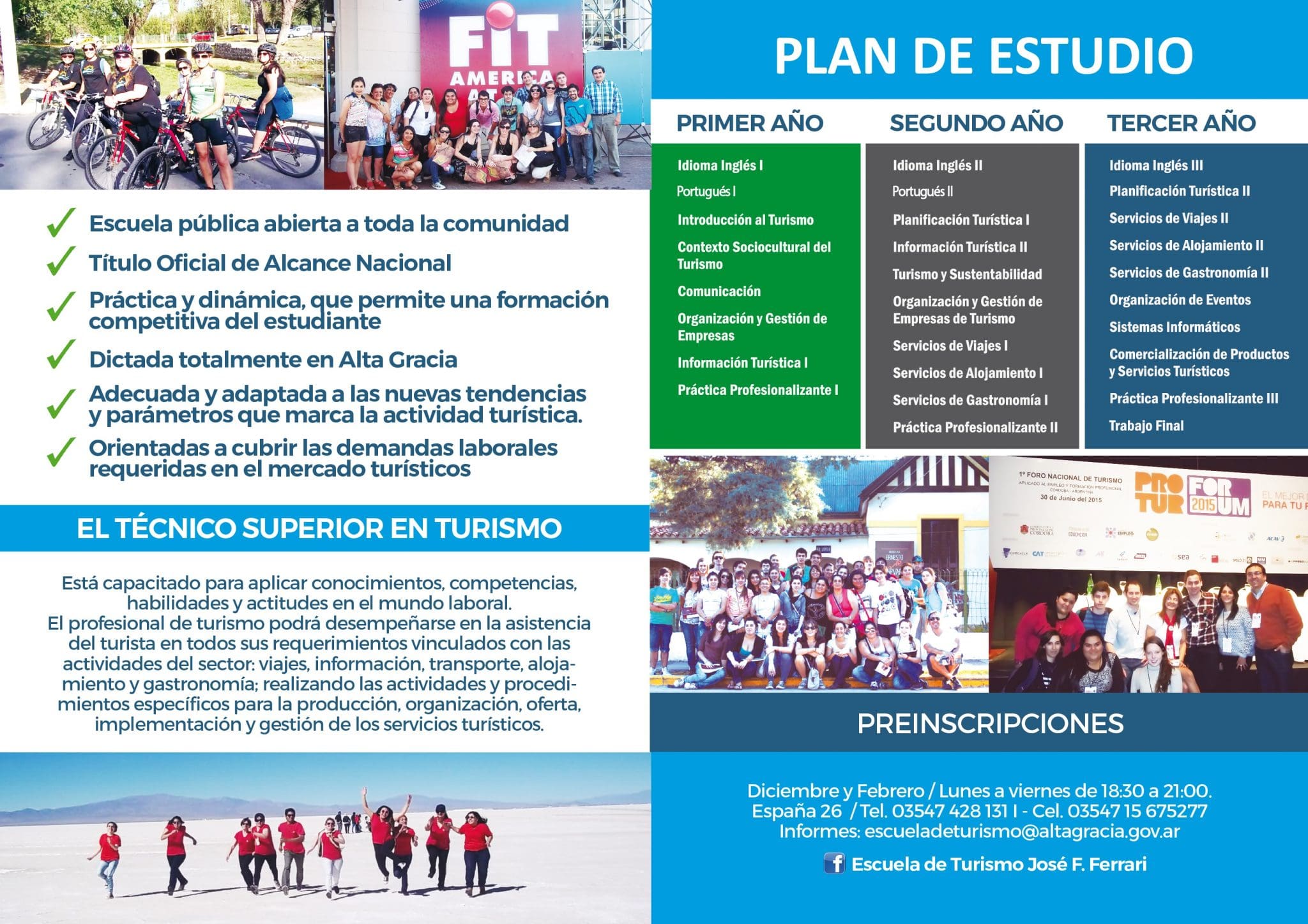 la Dirección de Educación de la Municipalidad de Alta Gracia, informa que siguen abiertas las pre inscripciones al ingreso de primer año para el ciclo lectivo 2019 a la carrera “Tecnicatura Superior en Turismo”, plan de estudio de validez nacional según RM 153/10. Los días de cursado serán de lunes a viernes de 18.30hs a 22.40hs.