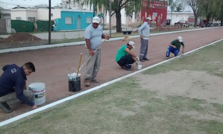 Colocación de equipamiento, bancos en torno a la pista.