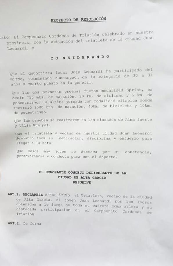 Hace minutos en la sesión del Honorable Consejo Deliberante, fue reconocido el triatleta de nuestra ciudad Juani Leonardi, esto fue a causa de la obtención del Subcampeonato en el Campeonato Cordobés de Triatlón.