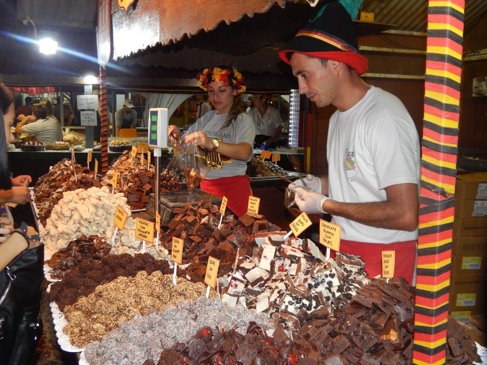 Muchas de las 24 carpas que participaron este año, optaron por privilegiar el sentido de la vista para atraer a los visitantes; en Alemania, un despliegue de chocolates( de distintos colores, sabores y texturas están dispuestos en un cálido stand de madera. Uruguay y Sudáfrica optaron para exhibir no solo su carnes asadas con distintas técnicas, sino que mucha gente se detiene, noche tras noche y desafiando el calor, para observar cómo se elaboran esos platos, que nunca cansan. Si hay algo que no falta nunca en Colectividades es el Shawarma, un plato tradicional del oriente medio, elaborado con láminas de carne de ternera, pollo o cerdo, cocidas en un asador vertical, y servidas dentro del clásico pan árabe pita junto con lechuga, tomate. Hay varios stands y países que ofrecen ese plato elaborado a la vista; Irak los acompaña además con trajes típicos y bailes en un escenario del que el Shawarma es el protagonista. La fondue de Francia, la paella de España, las pastas y las pizzas de Italia, todos atractivos que alimentan no sólo el gusto. Claro está, que eso no vale para todas las carpas; en varias, la presentación, la elección de las comidas o las vestimentas no se integraban con el espíritu de la Fiesta; lograr una armonía y algo de autenticidad en muchos de los puestos es algo que queda como un desafío pendiente para esta, así como de otras, comisiones.