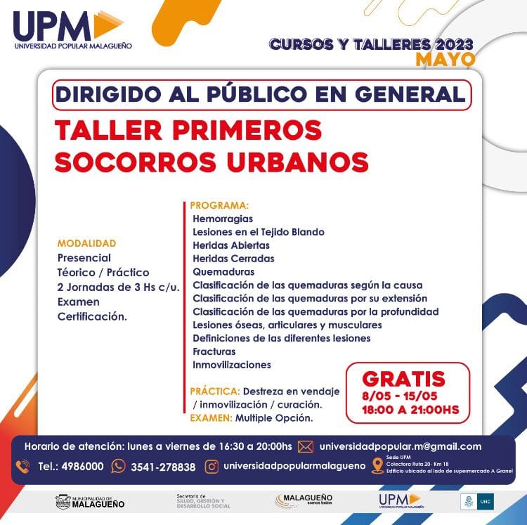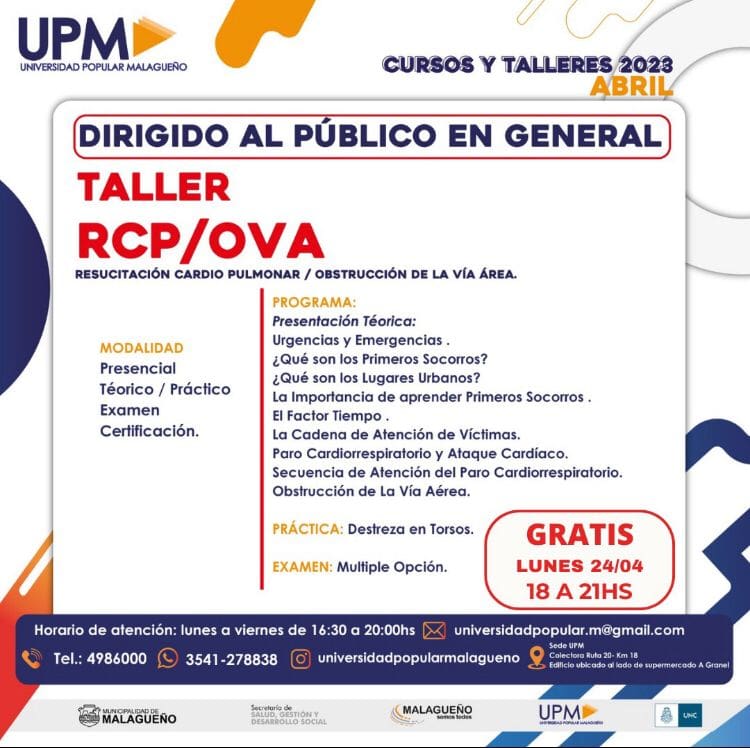 La Universidad Popular de Malagueño continúa sumando cursos y capacitaciones para sus vecinos. En esta ocasión, se realizarán diversas clases de RCP y primeros auxilios.