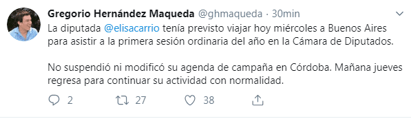 Mirá el twitt que hace minutos publicó el Presidente de la Coalición Civica ARI de la Provincia, Gregorio Hernández Maqueda, al respecto: