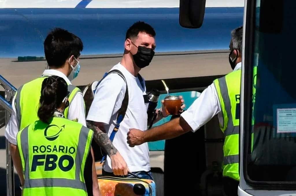 Messi descendió del avión por una de sus escalinata con una mochila en su espalda, una pequeña valija en su mano derecha, un mate sujeto con por la otra y un termo bajo con la axila del brazo izquierdo, según fue retratado por la cuenta especializada Saar Ari Ros en Twitter.