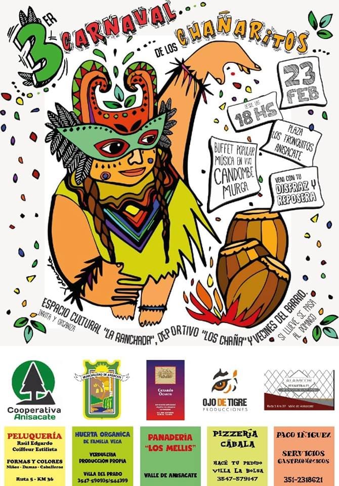 Este sábado se realiza la tercer edición del carnaval Los Chañaritos en la localidad de Anisacate, a partir de las 18:00hs comienza el espectáculo en la plaza Los Tronquitos de dicho lugar.