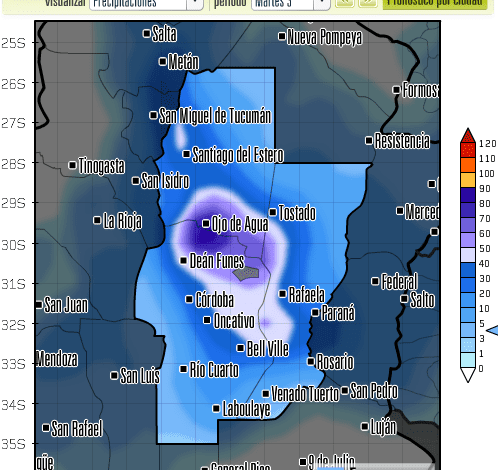 Martes 3 lluvias intermitentes y tormentas aisladas y en especial se observarán lluvias y tormentas fuertes sobre el extremo norte de córdoba, Santiago del Estero y Santa Fe, miércoles 4 con similares condiciones, abundante nubosidad y la localización de lluvias, mejoramientos temporarios. Jueves 5 y viernes 6 mejora lentamente el tiempo, aunque la nubosidad seguirá variable, el porcentaje de humedad elevado.