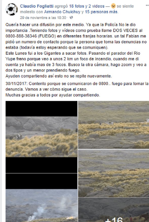 Las imágenes fueron tomadas por el fotógrafo Claudio Fogliatti, quien manifestó en facebook que se comunicó dos veces al 0800-888-38346 (FUEGO), sin que nadie diera una respuesta.