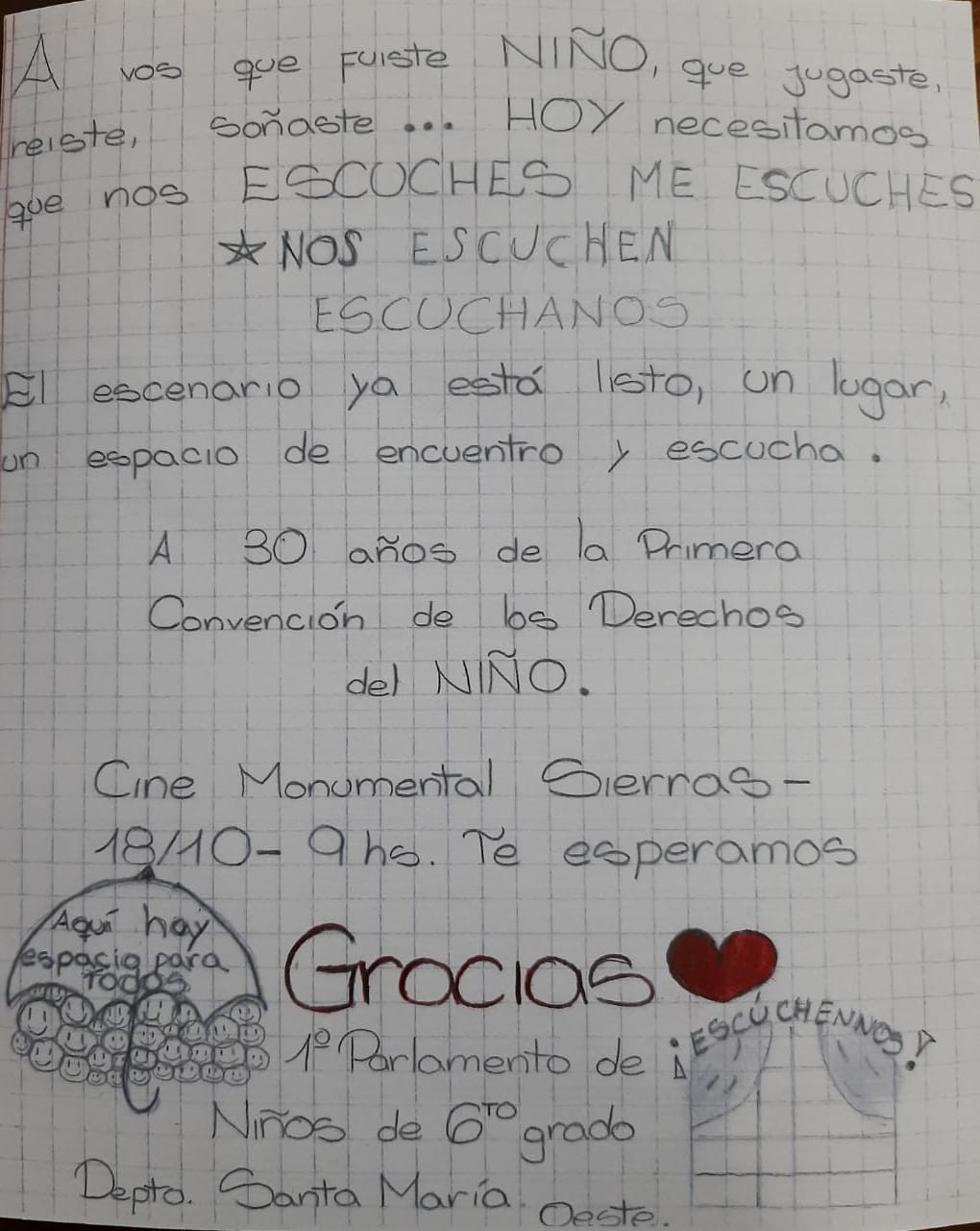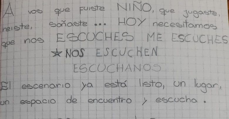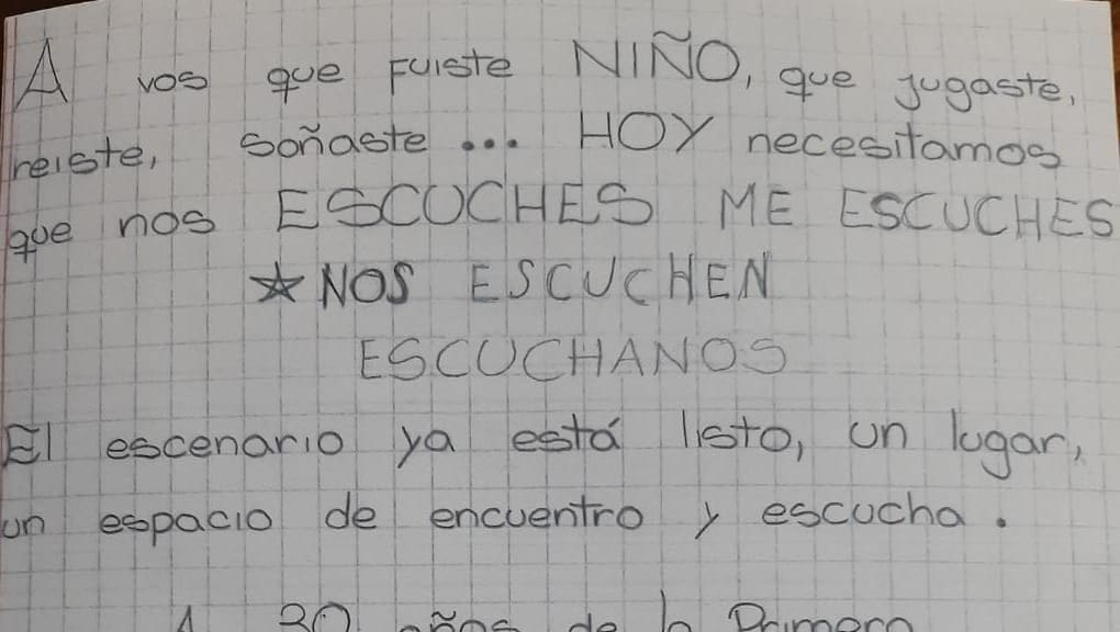«A vos que fuiste niño, que jugaste, reíste, soñaste; hoy necesitamos que nos escuches, me escuches, nos escuchen. Escuchanos. El  escenario ya está listo, un lugar, un espacio de encuentro y escucha» reza la invitación manuscrita, muy prolija, elaborada por un niño.