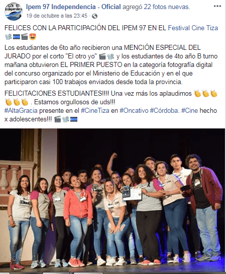 Por otra parte, los estudiantes de 6to año recibieron una mención especial del jurado, por el corto «El otro yo» dentro de la temática de enseñanza y aprendizaje sobre la protección online. Felicitaciones!