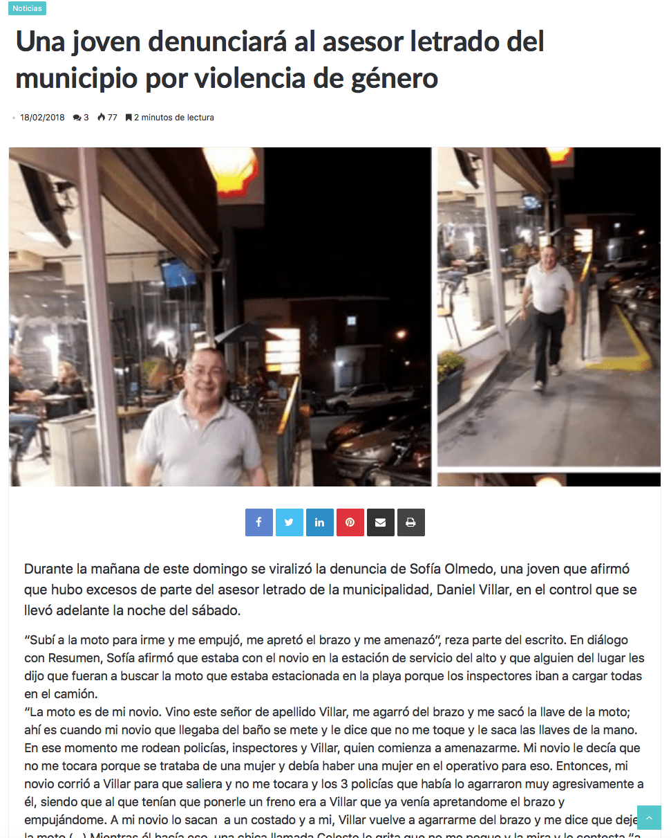 También, cabe recordar  la denuncia penal y pública que una vecina de Alta Gracia le hizo en 2018, nada más y nada menos que por violencia de género. Villar fue acusado de agredir física y verbalmente a la joven en un control de motocicletas, quien respaldó sus dichos con fotos y videos.
