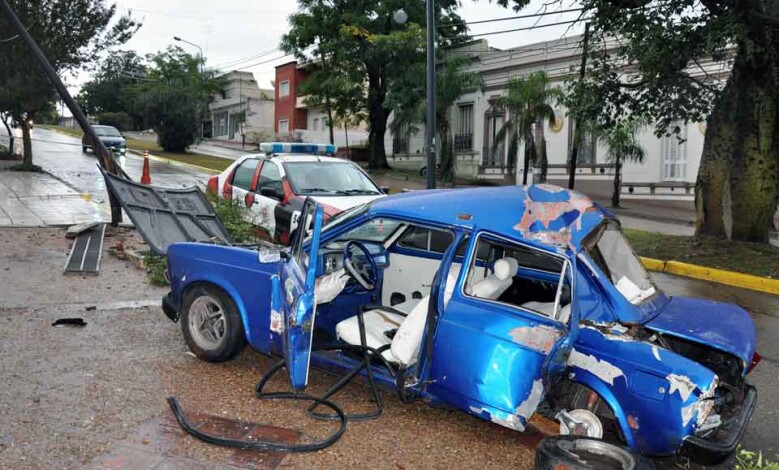 Un Fiat 128 quedó literalmente “incrustado” en la vereda de la Avenida Sarmiento, metros antes de la intersección con Achával Rodríguez, tras haber impactado con el poste de alumbrado público y algunos arbustos, durante la madrugada del domingo 17 de marzo.