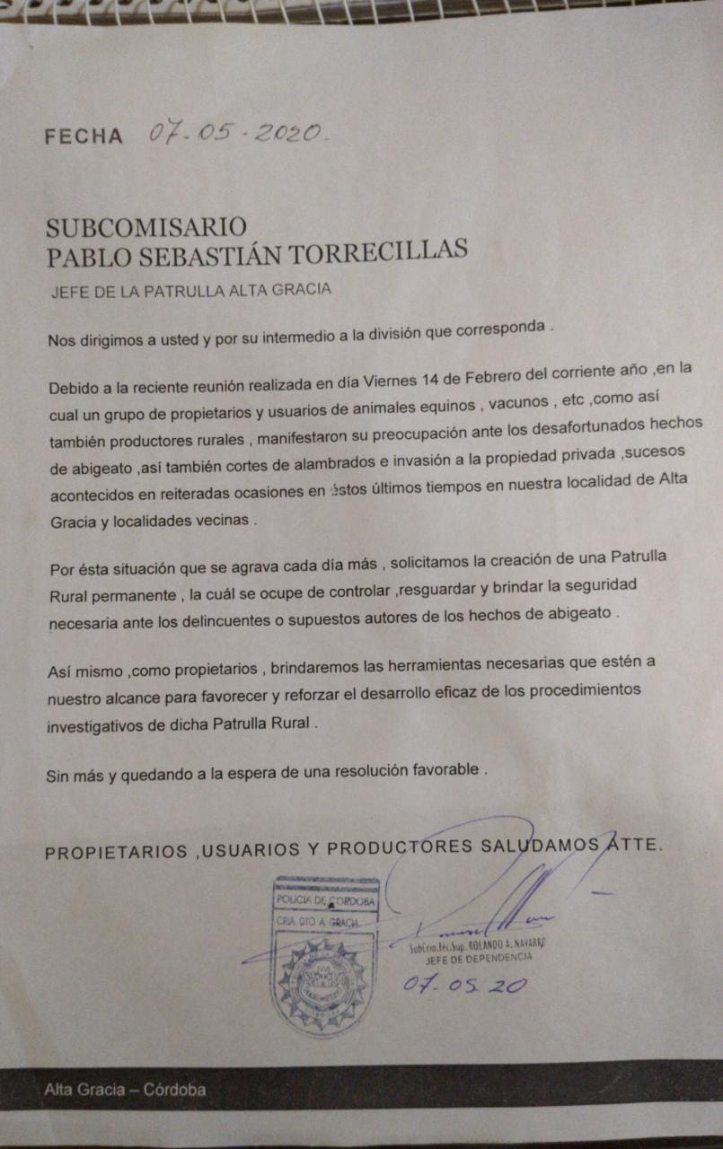 Finalmente y ante la nueva ola de robo de animales en Alta Gracia y alrededores, propietarios de ganado de diferentes puntos del departamento Santa María elevaron una nota a las autoridades policiales, en la cual tal y como anticipó RESUMEN, solicitan la creación de una «Patrulla rural permanente», un cuerpo especializado que investigue los hechos a fines de que las denuncias no queden en segundo plano.