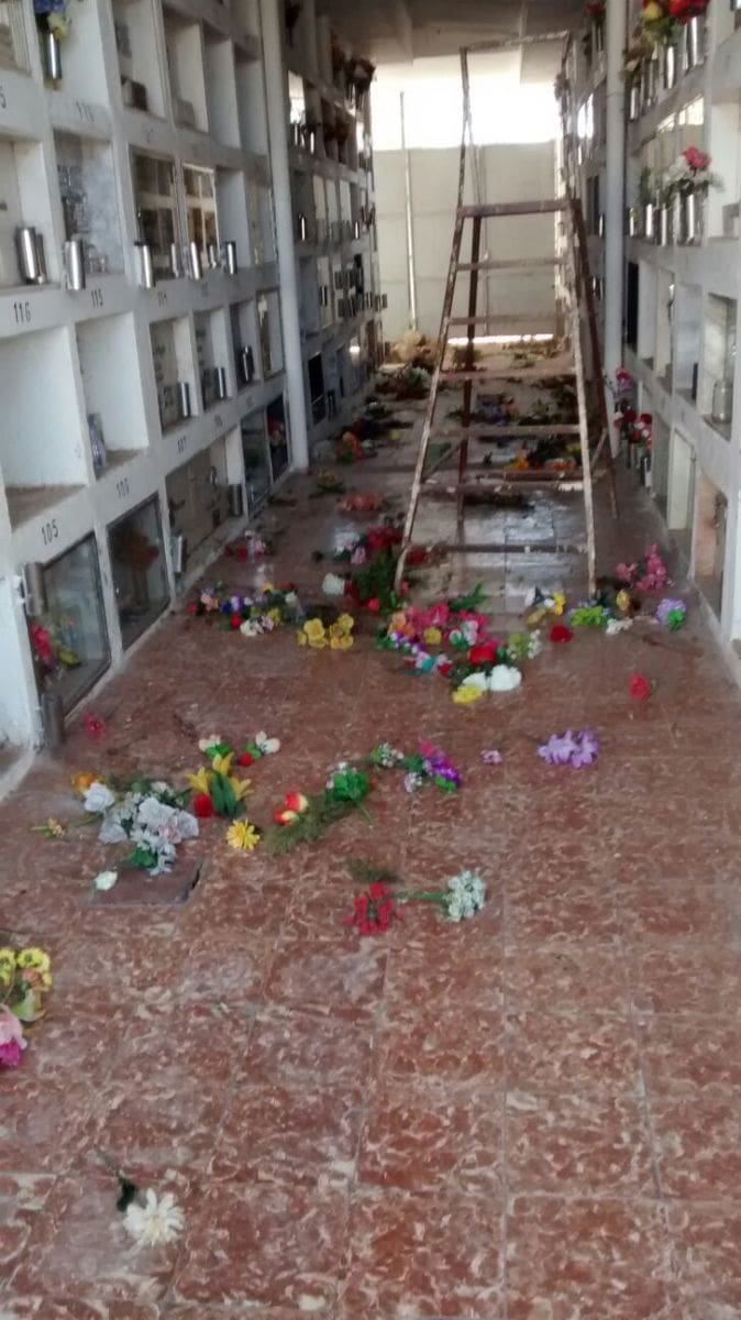 Floreros rotos y flores esparcidas por el corredor de dicho espacio fue el saldo de la intervención de un grupo de jóvenes violentos, según se presupone.