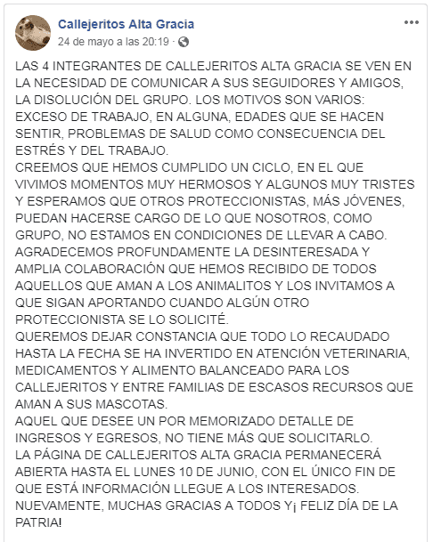 A través de su página de Facebook las cuatro integrantes de «Callejeritos Alta Gracia», informaron que el grupo se disolvería y la página sería dada de baja el 10 de junio.