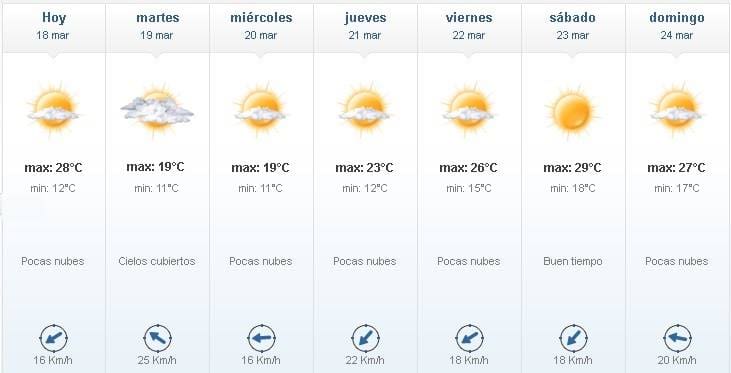 Durante el día la temperatura mínima será de 12º y la máxima de 28º. Vientos E a 10 a 15 km / h. con ambiente cálido a templado para la jornada de hoy.