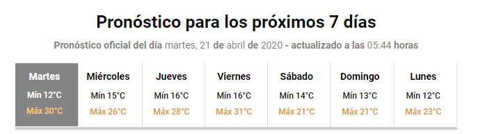 Sigue el veranito Mayra Gimenez 21/04/2020 Una jornada de verano, similar a la que se vivió ayer lunes, la que se espera para hoy en Alta Gracia de acuerdo a lo que prevé el Servicio Meteorológico Nacional. La máxima para hoy ronda los 30°. Mirá el extendido Noticias Relacionadas La Universidad Popular de Alta Gracia convoca a docentes para dictar capacitaciones Así se vivió el Fin de Semana en Alta Gracia ¿Cómo sigue el hombre que fue mordido por una Yarará en Falda del Carmen? Lunes lluvioso y con una máxima de 28° Domingo a pleno sol: la máxima podría alcanzar los 34° Paseo del Valle: Una propuesta para visitar los fin de semana