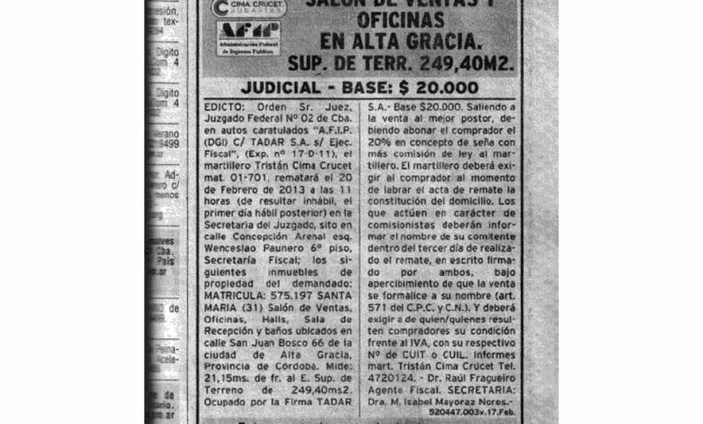 TADAR, empresa líder en ponchos, fundada en 1944 por Natalio Bijman, y que hace más de 65 años se encuentra en el mercado, anunció el remate de sus instalaciones el pasado sábado en un matutino provincial.