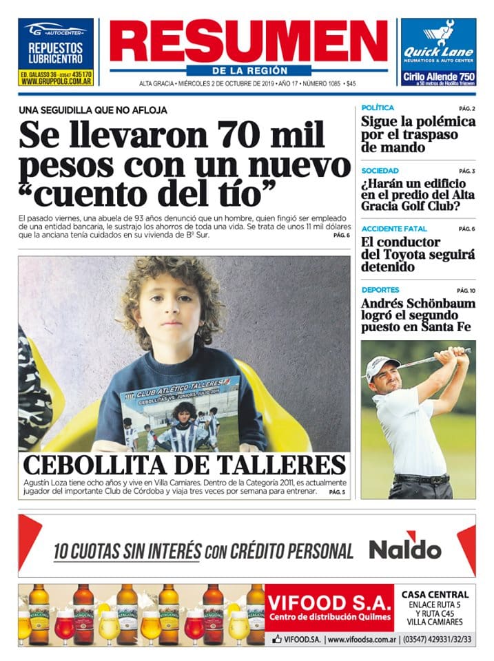 Facebook X LinkedIn Pinterest Messenger Messenger WhatsApp Telegram Compartir por e-mail Imprimir Tapa edición impresa miércoles 02 de octubre de 2019 02/10/2019Actualizado: 02/10/20190 45 Menos de un minuto Facebook X LinkedIn Pinterest Messenger Messenger WhatsApp Telegram Compartir por e-mail Imprimir Mostrar más Compartir Facebook X LinkedIn Pinterest Messenger Messenger WhatsApp Telegram Compartir por e-mail Imprimir