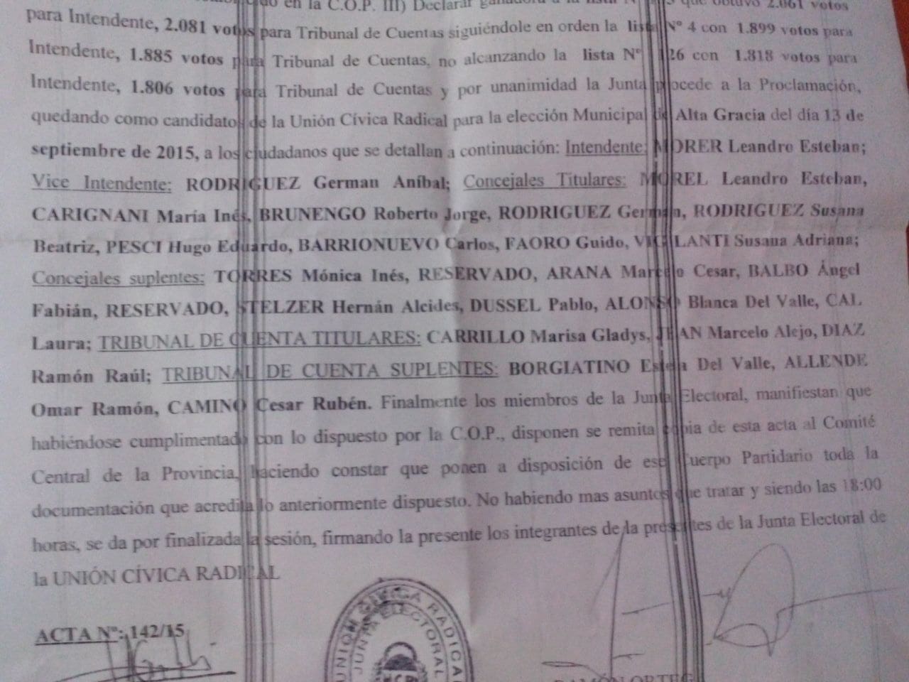 Al respecto, el órgano directivo provincial les comunicó a las partes interesadas que los nombres deben ordenarse de acuerdo a la posición que cada lista tuvo en las elecciones internas. Por ende, la gente de Leandro Morer deberá ocupar los puestos 1, 4 y 7 de la lista; los candidatos de Mario Bonfigli los puestos 2, 5 y 8 mientras que los de Roberto Brunengo los lugares 3, 6 y 9.